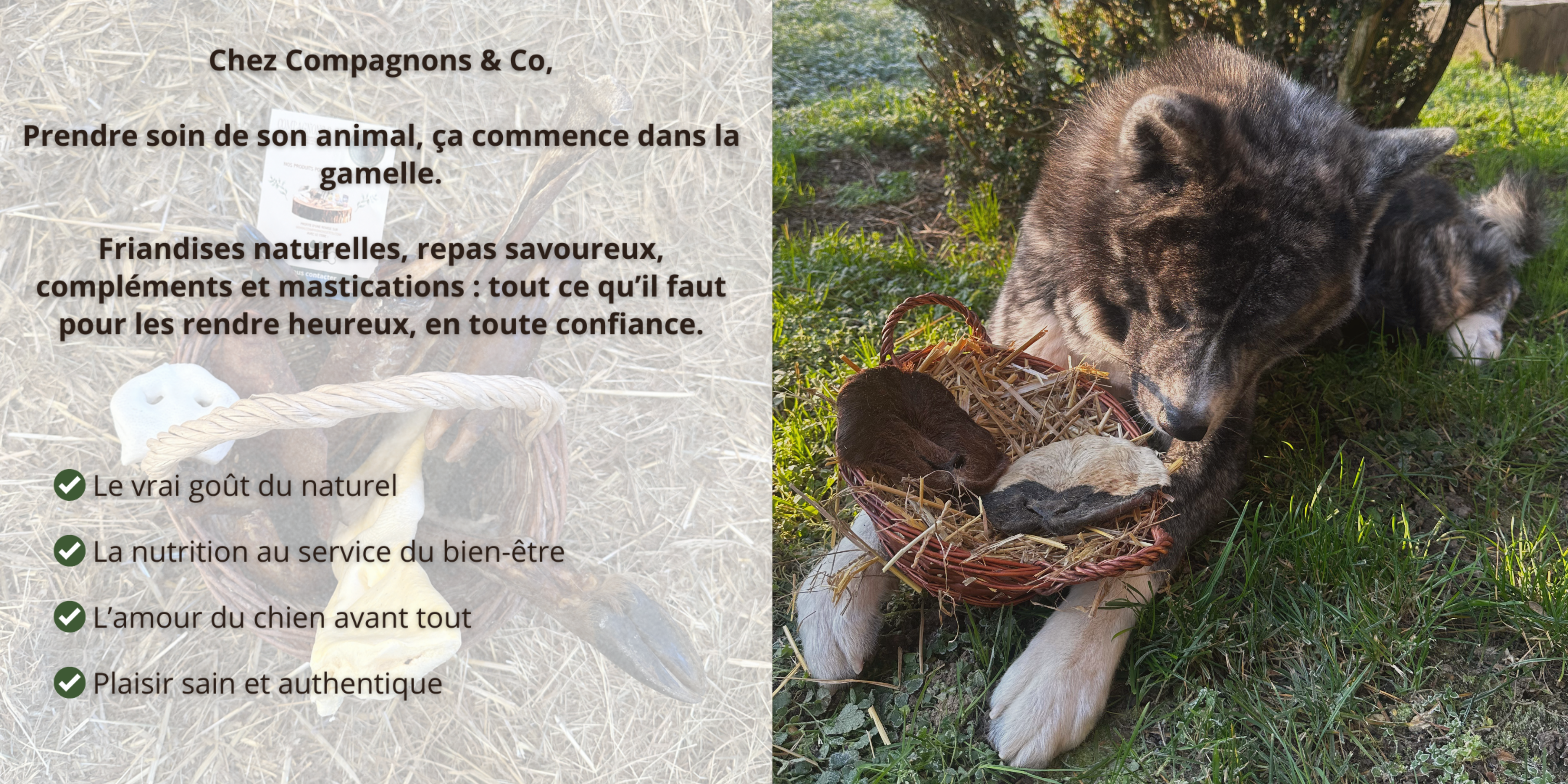 Chez Compagnons & Co, nous accordons une importance particulière à la provenance, à la qualité et à l’éthique de l’ensemble de nos friandises, quelle que soit la protéine concernée (bœuf, agneau, volaille, gibier, ou viandes dites plus « exotiques »).